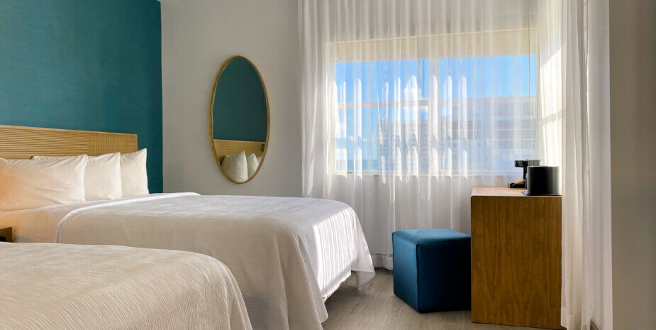 After a long day around town, nestle into a classic room featuring two double beds with premium linens, elegant bathroom fixtures, and carpeted floors.